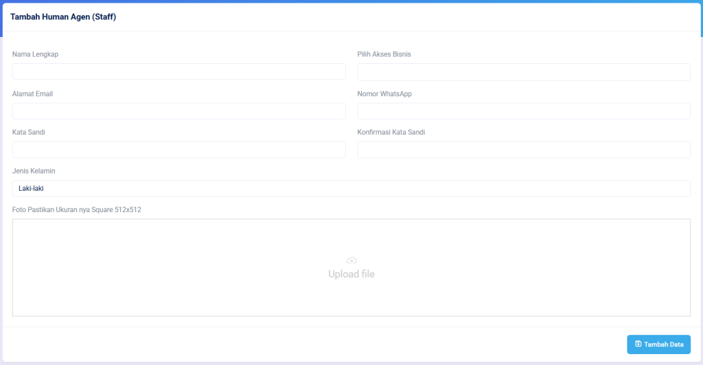 Tulis nama lengkap, pilih akun bisnis yang akan diberikan akses untuk human agent tersebut, email aktif, nomor WhatsApp aktif, dan password login Anda. Kemudian klik button Tambah Data.