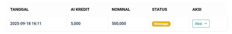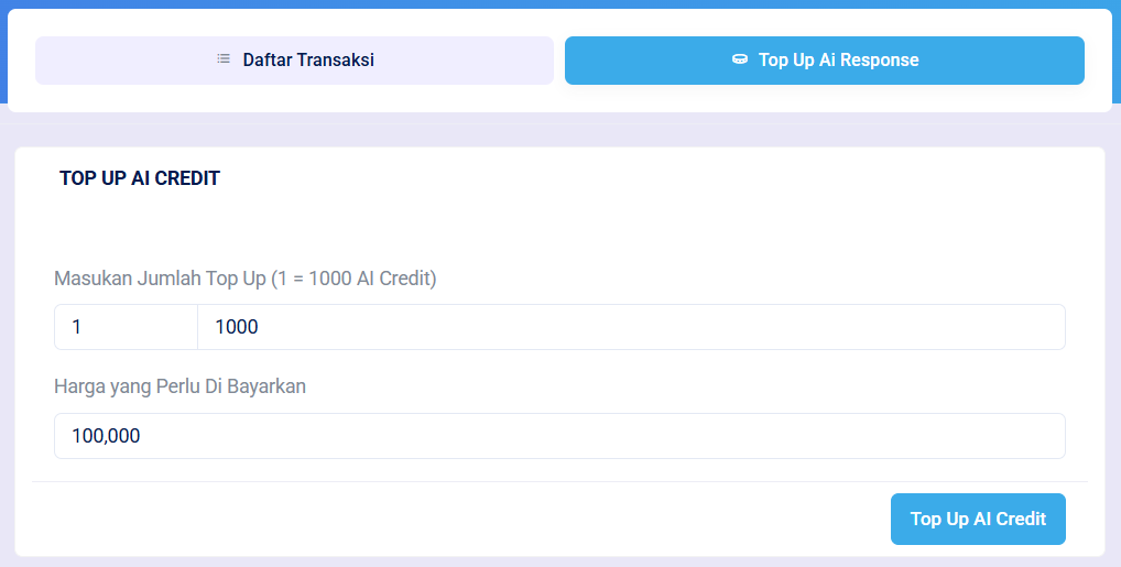 Dengan nilai topup Rp. 100.000, Anda akan mendapatkan kuota 1000 AI Response (per September 2025). Harga sewaktu-waktu bisa berubah.